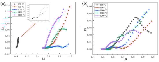 Through the validated FEM-DEM coupled high-temperature uniaxial compression model, the strain and density data of the powder at various temperatures were obtained. Figure 5a illustrates the relationship between axial strain and density during the uniaxial compression process. At lower densities, the axial strain remains close to zero, indicating that particle movement and rearrangement dominate at this stage, with minimal plastic deformation of the powder particles. As the compression progresses, the plastic deformation becomes more pronounced. Due to the softening effect at elevated temperatures, the axial strain increases more rapidly with rising temperature.