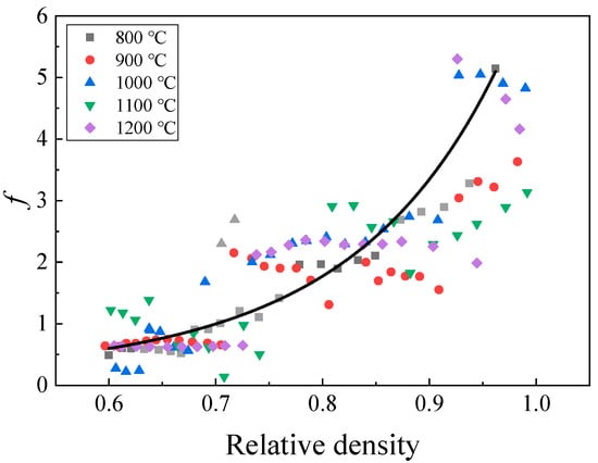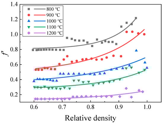 The yield strength of the fully dense Inconel 625 alloy matrix is 500 MPa. Combining the values of σ1 at different densities and temperatures, the corresponding values f for different densifications are calculated and the parameters f′ can be determined by substituting into Equation (8), as shown in Figure 7. Since the parameter f′ is related to stress and stress is affected by temperature, for powders with the same densification, higher temperature results in lower stress. Thus, the parameter f′ also decreases. From the figure, it can also be seen that at different temperatures, the parameter f′ increases with densification, and as densification increases, the rate of increase accelerates. Therefore, the calculated parameter f′ is fitted separately for each temperature, with the fitting results shown in Equation (9).