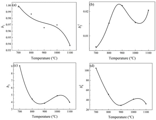 The variation trends of the material constants b1, b2, b3, and b4 after the function fitting are shown in Figure 8.
