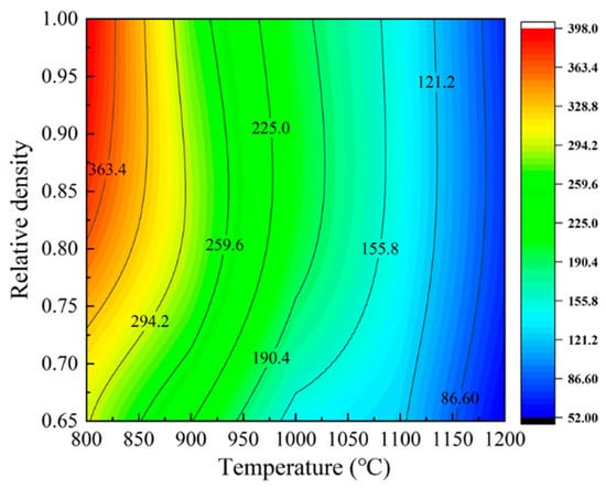 Based on the obtained parameters at various densities and temperatures, a yield stress map for the nickel-based alloy was constructed, as shown in Figure 9. In this figure, the contour lines represent variations in the yield strength with the temperature at a given density, and the labeled values indicate the corresponding yield stresses. The color gradient visually illustrates the yield stress distribution. As observed, the yield stress decreases with the increasing temperature, reaching a minimum of 52.087 MPa at 1200 °C. Conversely, as the density increases, the yield strength of the material also rises. Thus, the yield strength is jointly influenced by both the temperature and the density, exhibiting a nonlinear relationship. Although a higher density contributes to an increase in the yield stress, the dominant factor influencing its variation is the reduction caused by elevated temperatures. At a constant temperature, the maximum variation in the yield stress is 101.214 MPa, while at a constant density, the maximum variation is 244.515 MPa.
