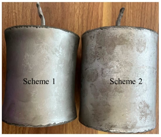 During the powder HIP process, powder densification is mainly driven by the deformation of the casing. Uniform deformation of the casing results in a uniformly densified final part. However, suppose the local deformation in the casing is too large or too small; in that case, it can not only lead to a casing rupture but also cause localized densification and non-uniformity in the formed part. Therefore, the deformation of the casing directly affects the total performance of the final part. The green bodies obtained from the two different HIP processes shown in Figure 2 are illustrated in Figure 10. The figure shows that after holding at 1000 °C and 120 MPa for 180 min under process scheme 1, the shrinkage deformation of the casing in the cylindrical part is noticeably greater than that of the cylindrical part formed with process scheme 2. To quantitatively compare the casing shrinkage deformation under the two process schemes, axial and radial measurements of the casing were performed. After measurements, it was found that the casing processed under process scheme 1 experienced an axial shrinkage of 13.24 mm and a radial shrinkage of 12.50 mm. After processing with process scheme 2, the casing experienced an axial shrinkage of 5.32 mm and a radial shrinkage of 4.46 mm. It is evident that the process parameters significantly affect the casing shrinkage and play a decisive role in the powder densification process.