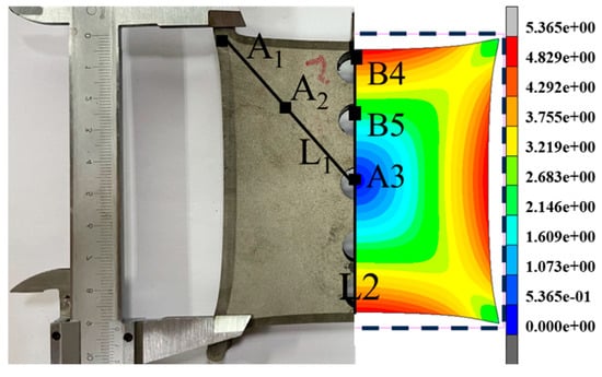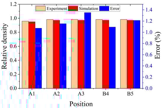 During the HIP process, powder densification is primarily driven by the deformation of the encapsulating structure. The degree of densification within the powder compact closely correlates with the extent of capsule deformation. Figure 11 provides a comparative visualization of the central axial cross-sections obtained from experimental observation and numerical simulation. As illustrated, the deformation profiles of the truncated capsule in the central axial direction are highly consistent, indicating good agreement between the model and experimental results. To further evaluate the fidelity of the simulation, two characteristic lines were selected: L1, extending diagonally from the powder corner to the center point, and L2, corresponding to the axis of symmetry through the center. Three feature nodes were designated along each line—A1, A2, and A3 on L1, and B4 and B5 on L2—with A3 located precisely at the intersection of L1 and L2, at the powder’s geometric center. Samples with dimensions of ø10 mm × 12 mm were extracted from each feature location. The sample densities were determined via the Archimedes drainage method, with each mass measurement repeated multiple times and averaged to enhance the measurement reliability. The measured densities were quantitatively compared with the simulated results at the corresponding nodes. The close match between the experimental and simulated densities validates the predictive capability of the simulation model.