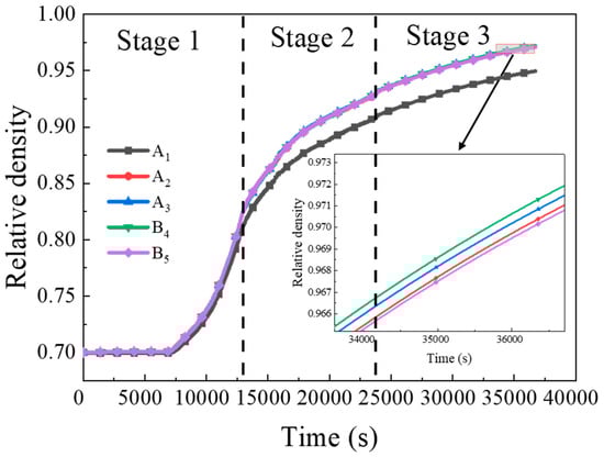 Figure 12 illustrates the density evolution of five feature nodes during the HIP process, which consists of three stages: heating and pressurization, holding and pressure maintenance, and cooling and depressurization. In the initial stage of the HIP, the density at each node decreases due to the thermal expansion of the powder, while the applied pressure is insufficient to counteract this expansion, resulting in a temporary increase in volume. However, this stage is brief, and the reduction in density is minimal compared to the overall increase. As the HIP process progresses, the temperature and pressure rise. At 7000 s, the density at each node begins to increase rapidly. The applied pressure becomes sufficient to exceed the powder’s yield strength, causing shrinkage and deformation. Since the initial powder packing is relatively loose, a significant plastic deformation occurs, leading to a more compact internal arrangement. For feature line L1, nodes A1, A2, and A3 exhibit similar density growth patterns, with densities steadily increasing after the initial HIP stage. The final densities of A2 and A3 reach approximately 0.97, higher than A1, due to A2 and A3 being closer to the center of the powder, while A1 is affected by its position at the edge, near the corner and end caps, resulting in a lower density. Nodes B4, B5, and A3 along line L2 show similar trends, with their density curves largely coinciding. After an initial reduction, the density increases steadily, but the rate of increase slows during the later holding stage as densification approaches saturation. At this point, the densification is primarily driven by diffusion and creep, and the final density reaches approximately 0.97.