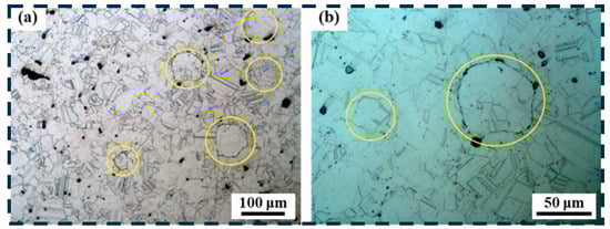 As shown in Figure 13, the microstructure of the billet, sampled from the center cross-section at a temperature of 1100 °C, a pressure of 120 MPa, and a holding time of 3 h, exhibits a density of 0.980. In comparison, Figure 12 shows that the simulated density at the center of the cylindrical part reaches 0.972. The minimal deviation between the simulated and experimental values confirms the accuracy of the simulation results. Figure 13 visually presents the microstructural features, showing a markedly more compact arrangement of powder particles. The pores are nearly eliminated, and the particles exhibit substantial plastic deformation, indicating effective densification during the HIP process. The billet was processed by HIP, a technique that applies high temperature and isostatic gas pressure to densify materials and eliminate internal pores. After HIP, the density of the powder material has substantially improved, with some regions showing almost complete elimination of porosity. However, original particle boundaries remain visible, and distinct grain boundary features can still be observed, as shown in the yellow circle. This indicates that, despite the applied process parameters, some powder particles did not fully fuse during HIP. The causes of this incomplete fusion are complex and are beyond the scope of this paper.