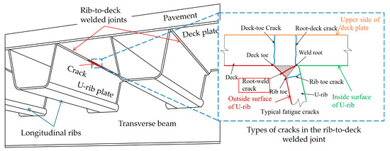 Orthotropic steel decks (OSDs) have been widely used in many long-span bridges and urban highways because of their light-weight, high strength, and durability characteristics and rapid construction [1]. OSDs are mainly assembled from comparatively thin steel plates (6–16 mm thickness) with welded joints. The assembled thin steel plates are stiffened longitudinally by ribs. These ribs provide additional stiffness to an OSD and help distribute the wheel loads [2,3,4]. Based on rib connection, the rib is generally classified as open- and/or closed-rib. Among them, many fatigue cracks forming the welded joints in the closed rib have been reported [5,6,7,8]. Figure 1 shows the typical welded joints in OSDs [9]. The fatigue cracks initiated from the rib-to-deck welded joints of OSDs are often considered troublesome, especially in Japan [6]. The fatigue cracks initiate from its weld root and propagate toward the weld bead and/or the deck plate [9]. These crack initiations cannot be visible. When these cracks become visible in the weld bead, they will be huge. In this condition, there is a possibility that the stiffness of the longitudinal rib suddenly decreases, involving the OSD in a critical situation, such as failure, collapse, and so on [10]. Therefore, the fatigue life of the weld root needs to be enhanced to prevent crack initiation from there and enhance its fatigue life.