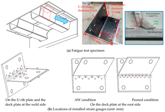 where l is the distance between the 5 mm location and the weld root, and tr and tthroat are the thickness of the U-rib plate and the throat thickness, respectively. The throat thickness was measured individually on each cross section of the fatigue test specimens. To monitor the compressive residual stress induced by peening treatment around the weld root side, four strain gauges were glued around 10 mm from the weld toe on the deck plate (hereafter, deck-toe), and eight strain gauges were glued around 2 mm from the root edge (U-rib plate and deck plate intersection point) on the deck plate.