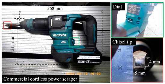 Figure 3 shows the apparatus used for the peening treatment. A commercial cordless power scraper (hereafter, cordless HPICR apparatus) was adopted [24]. The cordless HPICR apparatus has a rectangular steel chipper whose size is 4 mm × 5 mm with rounded corners of R = 0.5 mm. The total weight, including the steel chipper and battery, is about 3.4 kg. The cordless HPICR apparatus is electrically driven, and its portability is so high that it is easy to use and bring it on-site. The feature of the cordless HPICR apparatus is that the dial can change the treatment frequency into five different levels. The minimum treatment frequency was about 16 Hz (level 1), while the maximum one was about 54 Hz (level 5). The same quality control method as HPICR using an air chipper, with a peening indent depth more than 0.2 mm [24], could be adopted for the cordless HPICR apparatus. To achieve the indent depth, all test specimens were first treated with the second dial (21.7 Hz) and then with a third dial frequency (31.7 Hz) and higher.