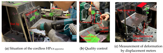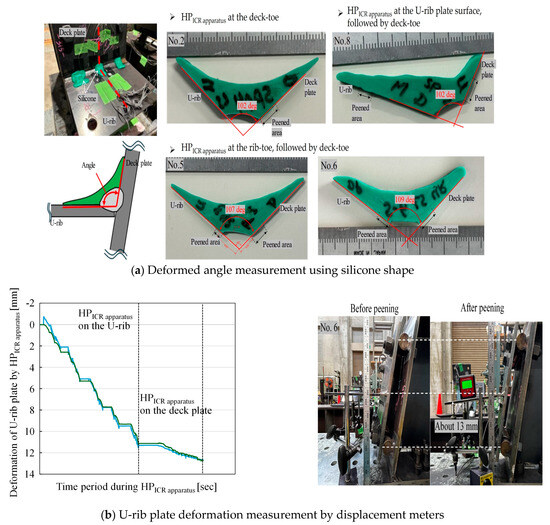 After the cordless HPICR apparatus procedure, to observe whether the U-rib plate was deformed, a mold around the welds was taken, and its angle was measured. In addition, deformation at the edge of the U-rib plate was monitored by using displacement meters, as shown in Figure 4c, to confirm how the U-rib plate is deformed while conducting the cordless HPICR apparatus procedure.
