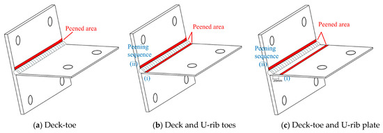Figure 5 shows the peening cases of the cordless HPICR apparatus. There are two cases, as shown in the figure. One case follows the method conducted in the previous study [15]. It is that the cordless HPICR apparatus is applied to the deck-toe only (Figure 5a). In the other case, it is applied to both the U-rib and the deck-toes (Figure 5b), aiming at inducing peen forming of the U-rib plate. One of seven specimens was peened 20 mm away from the U-rib toe (Figure 5c) to see how the peening location affects peen forming. The cordless HPICR apparatus on the U-rib side (U-rib toe and U-rib surface) was first engaged, and then the deck-toe was peened. When the treatment was performed at 20 mm, a jig was sandwiched between the ground and the U-rib because vibration by the cordless HPICR apparatus made the U-rib vibrate, and workability was excessively worsened. The cordless HPICR apparatus was positioned perpendicularly to either the deck plate or U-rib plate.