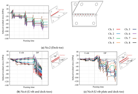 Figure 6 shows the measurement results of induced residual stress monitored at the root side of Nos. 2, 6, and 8. These stress values represent the stress component perpendicular to the weld. Figure 6a shows the results of the deck-toe peened specimen (No. 2). As shown in the figure, the amount of induced compressive residual stress into the weld root gradually increases with an increase in the number of cordless HPICR apparatus passes and finally reaches the range of −30 to −80 MPa. Figure 6b shows the results of the U-rib and deck-toes. The cordless HPICR apparatus at the U-rib toe tends to induce compressive residual stress of around −20 MPa at the edge of the test specimen. After the subsequent cordless HPICR apparatus procedure on the deck-toe, the compressive residual stress ranged from −50 to −100 MPa. Figure 6c shows the results of the U-rib plate, followed by the deck-toe (No. 8). It was found that the cordless HPICR apparatus on the U-rib plate does not introduce any compressive residual stress to the weld root side, as the peening location is 20 mm away from the weld toe. Also, the introduced compressive residual stress has a large scatter and is in the range of −20 to −100 MPa.