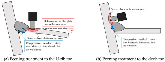 The fatigue test results of the cordless HPICR apparatus condition are then discussed. From the results of Nos. 2 and 3, one of the two specimens did not fail at the nominal stress range of 140 MPa, and both specimens failed at the nominal stress range of around 180 MPa. As a result, fatigue strengths show the JSSC-B class. These fatigue strengths are one class higher than those of the AW condition. From the No. 4, 5, 6, and 7 results, two of the four specimens started at the nominal stress range of around 170 to 180 MPa and reached the run-out. Then, the fatigue test continued at the nominal stress range of around 200 MPa. As a result, three specimens failed, and their fatigue strengths showed the JSSC-A class. The last specimen (No. 7) showed the JSSC-B class. This reason has been under investigation. From comparison with the results, it was found that the fatigue strengths of Nos. 4, 5, and 6 are clearly one class higher than that of Nos. 2 and 3. The main difference between them is treatment with or without peen forming. Peen forming can introduce higher compressive residual stress to the weld root than that by peening treatment at the deck-toe due to it is direct introduction of compressive residual stress to the weld root, as shown in Figure 6. Thus, the magnitude of compressive residual stress to the weld root is thought to be much higher than the latter one, and the fatigue strength of test specimens No. 4, 5, and 6 becomes stronger than that of Nos. 2 and 3. Hence, peening treatment on both the U-rib and the deck plate toes resulted in peen forming of the U-rib plate, consequently achieving one JSSC class higher fatigue life than with deck-toe peening only. Therefore, it can be concluded that peen forming, as an extended peening treatment method, is effective for obtaining fatigue life extension of the weld root in OSDs.