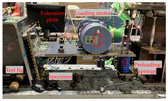 Figure 9 shows the setup of the test specimen for the fatigue test. The jig that was used when the cordless HPICR apparatus method was performed continued to be used. The test specimens were fatigue-tested using a plate-bending fatigue test machine developed by Yamada et al. [25]. The test machine was mounted on the edge of the U-rib plate with the help of an extended steel plate. The test machine’s characteristic is that any range of bending force can be applied to the test specimen. Bending force is generated by the vibration of an eccentric mass inside the test machine. The frequency of the fatigue test can be controlled by a control box. It is noted that resonance always occurs when the test specimen’s natural frequency corresponds to the fatigue test’s frequency. The natural frequency of the test specimen was preliminarily investigated and found to be around 10 Hz, and hence, a frequency for the fatigue test was set as around 9 Hz to avoid resonance.