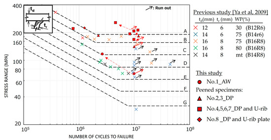 Figure 10 and Table 2 show fatigue test results. Fatigue design curves made by the Japanese Society of Steel Construction (JSSC) [4] are depicted. For the comparison of fatigue strength in the AW condition, the fatigue test results by Ya et al. [23] are also plotted in the figure. Some fatigue test specimens did not fail and reached the run-out, indicated by black arrows. Red dashed lines mean that the fatigue tests continued with an increase in the nominal stress range after the run-out.