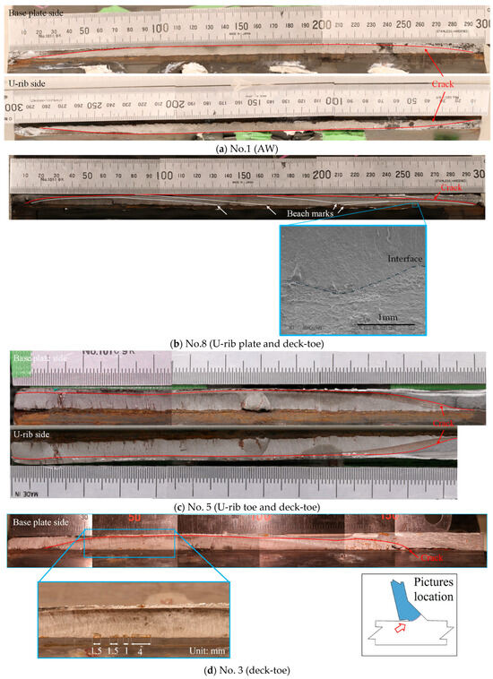 Figure 11 shows the fractured surfaces of Nos. 1, 3, 5 and 8. From observation, it was found that the fatigue cracks initiated from the weld root at the base plate side, as the leftover or weld root side could be seen on the fractured surface of the U-rib side. Hattori et al. [26] observed in their experiments that fatigue cracks initiated from the weld root on both the U-rib and the deck plate side, with the former being more probable. However, in this study, fatigue cracks always initiated from the deck plate side. The specific reason for this is unknown, but it should be noted that this does not interfere with the aim of the study. From Figure 11b, multiple fatigue cracks initiated from the weld root. According to SEM observation, the crack initiation site would be the interface that existed in the weld root. After some crack propagation, these fatigue cracks were merged into one large semicircular shape, which then went through the weld bead. In the case of No. 5, multiple weld imperfections whose maximum size was around 4 mm were observed around the crack initiation site. Despite including weld imperfections, the fatigue life of No. 5 was longer than that of No. 3. Therefore, from this point of view, it is inferred that the effect of fatigue life enhancement by peen forming is more significant than peening treatment by deck-toe peening only.