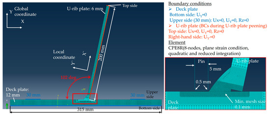Figure 12 also shows the boundary condition of the simulation model. The bottom of the deck plate of the test specimen model is considered to provide vertical support (Uy = 0) and to represent the fatigue test condition; the bolted area, where the length is 30 mm, is fixed and depicted with blue lines. For the top side of the U-rib plate, Ux = 0, Uy = 0, and Rz = 0 is applied. A temporary boundary condition at the right-hand side of the U-rib plate is considered when peening on the U-rib plate to achieve the desired peening depth.
