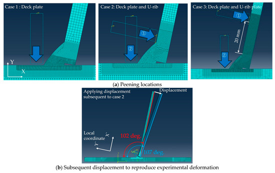 Figure 13 shows the simulation cases of peen treatment. Peening treatment using the cordless HPICR apparatus was numerically simulated. For the sake of simplicity, the pin strike movement is represented by the enforced displacement given to the pin model. This type of static analysis is called a displacement-controlled simulation, e.g., [29]. The pin strikes the test specimen model once to reach a certain indentation depth, and then it is forcibly pulled out. The depth is 0.3 mm, the same as in the experiments. According to the experiment discussed in Section 2, three peening cases are assumed, as shown in Figure 13a. The peening cases are the deck-toe, the U-rib and the deck-toes, and the U-rib plate at 20 mm from the U-rib toe and the deck-toe. The numbers depicted in Figure 13a indicate the order of the peening treatment.