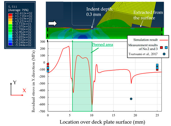 Before the numerical simulation, its validity is confirmed by comparing the experimental and simulation results. Figure 14 shows the simulation results of case 1. The stress component in the X-direction is shown. This figure depicts a numerical simulation result previously conducted by Tsutsumi et al. [16]. Moreover, compressive residual stresses measured near the deck plate beside the weld toe and the root side are also included. Compared to the current simulation results, Tsutsumi [16] showed much higher compressive residual stress at the weld root. The difference is around 40%. This could be due to the difference in the simulation method. They employed thermal expansion strains to reproduce the plastic strain derived from hammer peening. The comparison of the experimental and numerical results shows that the simulation result captures the experimental results well, and the difference between them is less than 10%. Therefore, it can be judged that the numerical simulation model is valid enough to simulate compressive residual stress introduced by the cordless HPICR apparatus.
