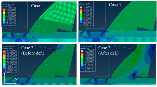 Figure 15 shows the numerical simulation results as induced residual stress contours. These stress contours represent minimum principal stresses. From the results of cases 1, 2, and 3, the minimum principal stress can be seen at the weld root of the deck plate side. These values are around −200 MPa. From the result of the application of deformation after the peening treatment in case 2, it can be seen that the blue contour area is significantly expanded. Table 4 shows the minimum principal stress extracted from the crack initiation point at the weld root of the deck plate side. After the application of deformation, the value at the weld root of the deck plate side was around −600 MPa. In this table, the stress at the weld root of the U-rib side, which is a more common crack initiation site, is shown. In addition, stress values with 160 and 200 MPa pre-loading at the 5 mm location are also shown. After applying 160 MPa, it was found that the minimum principal values at the weld root of the deck plate side are either in tension or around zero in cases 1 and 3 but still in compression in case 2. Hence, fatigue failure occurred in the former case and did not occur in the latter case. This captures the trend in the experiment results shown in Table 2 well. Therefore, the higher fatigue strength enhancement observed in the experiment can be attributed to the high compressive residual stress introduced around the weld root by peen forming.