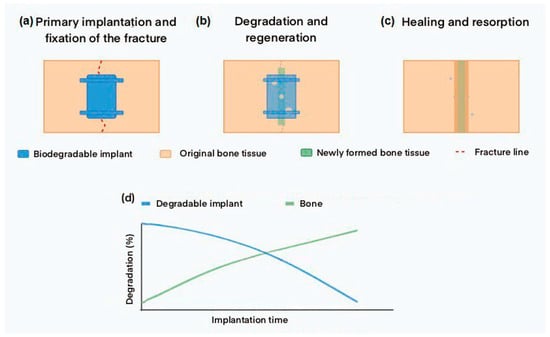 Schematic of biodegradable implant temporary functioning: (a) Initial implantation and fracture fixation. (b) Gradual implant degradation and new bone tissue formation. (c) Complete fracture healing and implant resorption. (d) Graph showing the relationship between implant degradation and forming bone during rehabilitation.