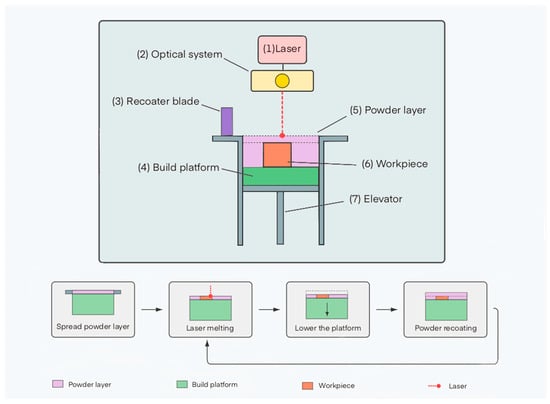 Schematic representation of the main components of an SLM setup and process stages: (1) laser, (2) focusing and scanning system, (3) powder delivery device, (4) build platform, (5) powder layer, (6) finished part, (7) elevator. The diagram also shows the sequential stages: powder layer deposition, laser beam scanning, platform lowering, and application of a new layer.