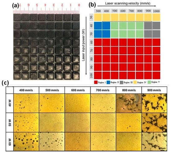 SLM processing optimization for ZK60 magnesium alloy: (a) macro-morphology in xy plane showing different processing regions, (b) processing parameter map with laser power (40–60 W) and scanning speed (400–900 mm/s), (c) porosity analysis and optical microscopy images corresponding to the marked region in (b), demonstrating the relationship between energy density and part quality. The dotted box in (b) outlines the region corresponding to the samples shown in (c), reprint with permission from Ref. [], 2021, Elsevier.