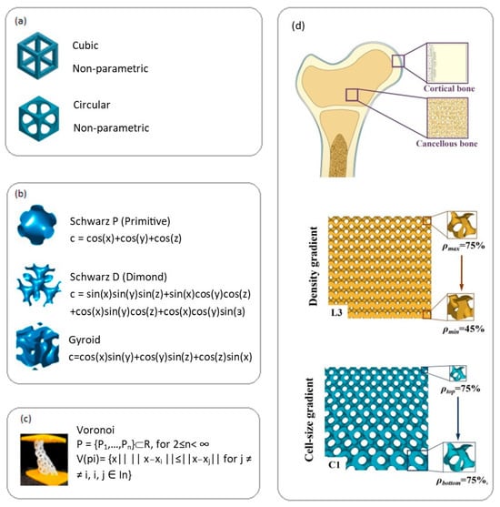 Depending on design and geometry, lattice structures of biodegradable implants are divided into several types. Regular lattice structures (Figure 4a) use repeating cells (cubic, tetrahedral, etc.) for predictable and customizable mechanical properties []. Triply periodic minimal surfaces (TPMS) (Figure 4b), such as Schwarz and gyroid structures, provide smooth transitions and good permeability []. Voronoi structures (Figure 4c) create stochastic structures and show enhanced cell proliferation []. Biomimetic structures recreate the architecture of natural tissues such as bone []. Functionally gradient structures (Figure 4d) change parameters (porosity, cell size) to create zones with different properties [].
