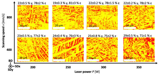 For iron alloys, which have a higher melting temperature, increased laser power (200–400 W) is required. Ewald et al. (2021) showed that a power of at least 200 W is necessary to achieve optimal density and mechanical properties of the Fe-Mn-Al-Ni alloy (SLM Solutions Group AG, Lübeck, Germany) [].