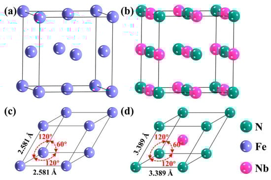 The CASTEP software package (Materials studio 2020), which combines density functional theory with plane wave pseudopotential method, was used for all calculations. The ultra-soft pseudopotential mode is employed to research the interaction between the nucleus and the electron, the Perdew–Burke–Ernzerhof (PBE) functional within the generalized gradient approximation (GGA) was chosen as the exchange-correlation action of the electron [], and a special k-point method in the form of Monkhorst–Pack was used for the first Brillouin zone integral. The cutoff energy was set to 380 eV and the k-points mesh were selected as 4 × 4 × 4 and 4 × 4 × 1 for the bulk sample and interface, respectively. When full relaxation was performed on the atoms, the self-consistent convergence conditions of the iteration were that the total energy was less than 1.0 × 10−5 eV/atom, the average atom force was under 0.03 eV/Å, the tolerance shift was not exceeding 0.01 nm, and the maximum stress deviation was 0.05 GPa. The valence electron states of the atoms involved in the calculation are Fe3d64s2, N2s22p3, and Nb4s24p64d45s1, respectively.