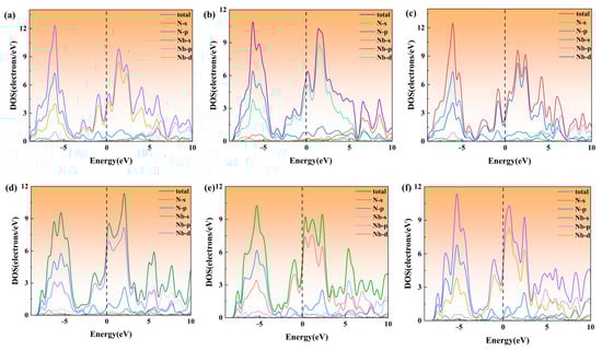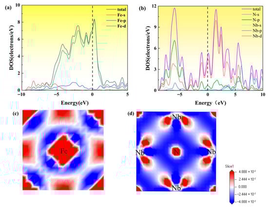 Figure 2 presents the density of states of fcc-Fe versus NbN, with the black vertical dashed line representing the Fermi level. As seen in Figure 2a, the value of the density of states at the Fermi level is not zero, indicating that fcc-Fe is metallic. For fcc-Fe, the total state density mainly comes from the contribution of Fe-d orbitals, while the contribution of s and p-orbital electrons to the total state density is relatively limited. The density of states curves of different orbitals are not completely independent; in some energy regions there are crossovers and overlaps between the density of states of different orbitals, suggesting that there may be some interactions between the orbitals. The density of states shows there are significant peaks in the energy range from −5 eV to 5 eV and even wider, indicating that the electrons are highly delocalized, which fully demonstrates the characteristic of metals relying on free electrons for electrical conductivity. Figure 2b plots the density of states for the bulk phase structure of NbN, which is also not zero at the Fermi level, which indicates that NbN also possesses part metallic characteristics. In the energy range from −10 eV to −5 eV, the total density of states is mainly contributed by the p-orbitals of N atoms and the d-orbitals of Nb atoms, while near the Fermi level, it is mainly contributed by the d-orbitals of N atoms, and the p-orbitals of N atoms also have some contribution. Additionally, there is hybridization between the different orbitals, indicating a strong interaction between the atoms.