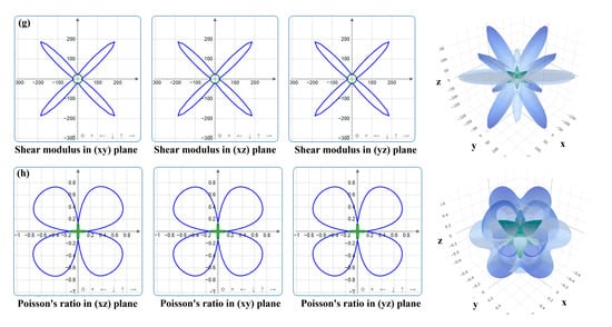 The strength of the elastic anisotropy of the material can be expressed by the value of the anisotropy. When the value is equal to 1, the corresponding material presents complete elastic isotropy, otherwise, it corresponds to elastic anisotropy. Simultaneously, the anisotropy value is positively correlated with the degree of elastic anisotropy, with larger values indicating a higher degree of material anisotropy. Table 1 and Figure 3 represent the elastic anisotropy of fcc-Fe and NbN. As shown in Figure 3a, the anisotropic distribution of the Young’s modulus of fcc-Fe is the same in the three-dimensional direction, with the maximum and minimum values of 616.36 GPa and 322.53 GPa, respectively, and an anisotropy value of 1.88, which indicates that there is a relatively small difference in the ability of fcc-Fe to resist tensile or compressive deformation in different directions. As shown in Figure 3e, the maximum and minimum values of Young’s modulus of NbN are 599.25 GPa and 66.63 GPa, respectively, and the anisotropy value is as high as 8.993. The difference in the ability of NbN to resist tensile or compressive deformation in different directions is extremely significant compared to fcc-Fe. From Figure 3b,f, the linear coefficients of fcc-Fe do not exhibit anisotropic behavior in the X, Y, and Z directions, indicating that fcc-Fe is isotropic, whereas the linear coefficients of NbN with the maximum value of 1.28 TPa−1 and the minimum value of 1.16 TPa−1 indicate that the value of anisotropy is close to one. Shear modulus is a measure of the ability of materials to resist shear deformation. From Figure 3c,g, the shear modulus of fcc-Fe displays the same distribution in X, Y, and Z directions, with the maximum, minimum, and anisotropic values of 269.98 GPa, 122.80 GPa, and 2.09, respectively, which shows that there are some differences in the ability of fcc-Fe to resist shear deformation in different directions. Accordingly, the values of NbN are 263.44 GPa, 22.92 GPa, and 11.49, respectively. Compared to fcc-Fe, there is a large difference in the ability of NbN to resist shear deformation in different directions. It can be seen from Figure 3d,g that the distribution of Poisson’s ratio anisotropy of fcc-Fe is relatively complex, with a maximum value of 0.48 and its anisotropy value approaching ∞. Poisson’s ratio of NbN also has an obvious anisotropic distribution, with the maximum and minimum values of 0.88 and 0.02, respectively. Overall, elastic anisotropy is present in both fcc-Fe and NbN; however, the degree of anisotropy in Young’s modulus, shear modulus, and Poisson’s ratio is more significant in NbN than those in fcc-Fe. For the linear coefficients, both exhibit a relatively small difference, and thus display anisotropy.