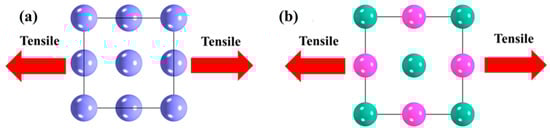 where, is the a-axis lattice constant of fcc-Fe or NbN crystals, as well as is the a-axis lattice constant when the strain is δ. Figure 4a,b presents the tensile model of fcc-Fe with NbN, i.e., the strain is gradually applied along the a-axis. To eliminate the interference of structural internal stresses during stretching, the a-axis orientation of individual atoms is fixed, and the lattice constants b and c of the model are allowed to undergo free relaxation during the optimization of the fcc-Fe and NbN configurations.