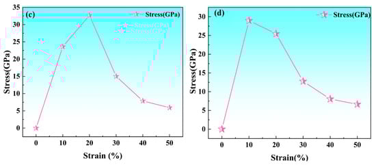 The stress-strain curves for simulated fcc-Fe with NbN bulk phase stretching are displayed in Figure 4c,d. Overall, two different materials offer a degree of resistance to deformation. As seen in Figure 4c, during the stretching of fcc-Fe, the stress change is divided into two stages, and the first stage is when the stress is 0–20%. When the strain is increased from 0% to 10%, the stress increases with the increase of strain and the stress-strain curve increases in a linear relationship. As the strain increases from 10% to 20%, the rate of stress increase slows down although the stress also increases, and it reaches a maximum tensile strength of 32.6 GPa when the strain reaches 20%. The second stage is the decline stage, that is, the strain is located in the 20–50% interval. When the strain continues to increase, the stress gradually decreases, indicating that the ability of the material to carry external forces is gradually destroyed with the destruction of the material structure. From Figure 4d, the stress-strain curve of NbN is similar to that of fcc-Fe, i.e., when the strain increases from 0% to 10%, the stress increases rapidly and reaches the maximum tensile strength of 29 GPa at 10%. The rapid decrease in stress with the increase in strain after the peak stress is reached indicates that NbN has poor plasticity, and it is difficult to carry out plastic deformation between its internal atoms through deformation mechanisms.