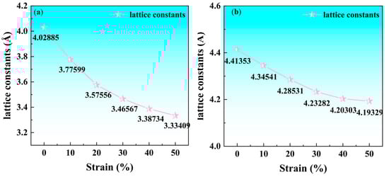 Figure 5 shows the lattice constant (b,c) changes of fcc-Fe and NbN bulk phases. From Figure 5a, the lattice constant of fcc-Fe is 4.029 Å at a strain of 0%. The lattice constants (b,c) tend to decrease continuously as the strain increases from 0% to 50%, and the lattice constant decreases to 3.334 Å when the strain reaches 50%. This indicates a continuous reduction of the atomic spacing in the fcc-Fe bulk phase as the external tensile strain increases. This may be explained by the fact that during the stretching process, the atoms inside the crystal are subjected to external forces and the equilibrium between the atoms is broken, and the interaction forces between the atoms induce the atoms to rearrange themselves, resulting in a decrease in the lattice constants, which is responsible for the disruption of the fcc-Fe structural model to a certain extent. It can be observed from Figure 5b that the lattice constant of NbN is 4.414 Å at the initial state (strain of 0%), and the lattice constants (b,c) likewise continue to decrease during the increase in strain from 0% to 50%; the lattice constant becomes 4.193 Å at 50% strain. Similar to fcc-Fe, the NbN lattice constant decreases with increasing strain, indicating that the positions of the atoms within the NbN crystal are changed and the interatomic distances are shortened under tensile strain. Comparing the both initial lattice constants, the initial lattice constant of the latter is larger than that of the former, and the decrease degree of the lattice constant of NbN under 50% strain is slightly smaller than that of fcc-Fe, which indicates that under external force, the internal atomic forces within NbN are relatively strong, and its ability to resist deformation is also relatively high.