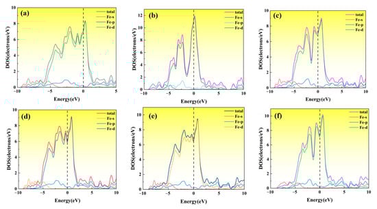 Figure 12g–i shows the density of states with both vacancies and alloying elements, and the density of states with only one vacancy differs insignificantly from the clean interface. From the density of states containing both vacancies and the alloying element Co, it can be seen that near the Fermi energy level, the total density of states is dominated by the contribution of Fe-d and Co-d orbital electrons. The Fe-d orbitals at the interface exhibit a peak of 11.90 eV at −1.75 eV and the Co-d orbitals show a peak of 2.30 eV at −2.00 eV. Compared to the density of states containing only the alloying element Co, there is a slight weakening of the Fe-d orbital peaks along with a slight weakening of the electrons provided by the Co-d orbitals, whereas the overall trend remains consistent.