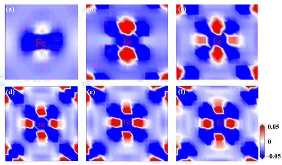 Differential charge density of the fcc-Fe bulk phase at different strains. (a) 0%, (b) 10%, (c) 20%, (d) 30%, (e) 40%, and (f) 50%.