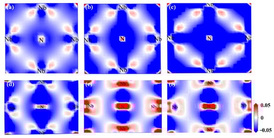 Differential charge densities of the NbN bulk phase at different strains. (a) 0%, (b) 10%, (c) 20%, (d) 30%, (e) 40%, and (f) 50%.