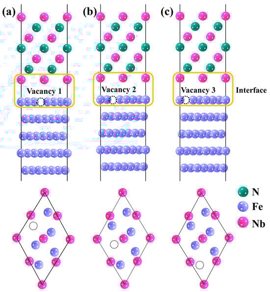 To evaluate the optimal occupation sites of vacancies in the interface fcc-Fe(111)/NbN(111), three different sites in the first layer of the interface are selected based on the symmetry, as shown in Figure 10, and the individual vacancy formation energies of the interface fcc-Fe(111)/NbN(111) are calculated with the expression shown in Equation (2). The instinct property is revealed in ref. [].