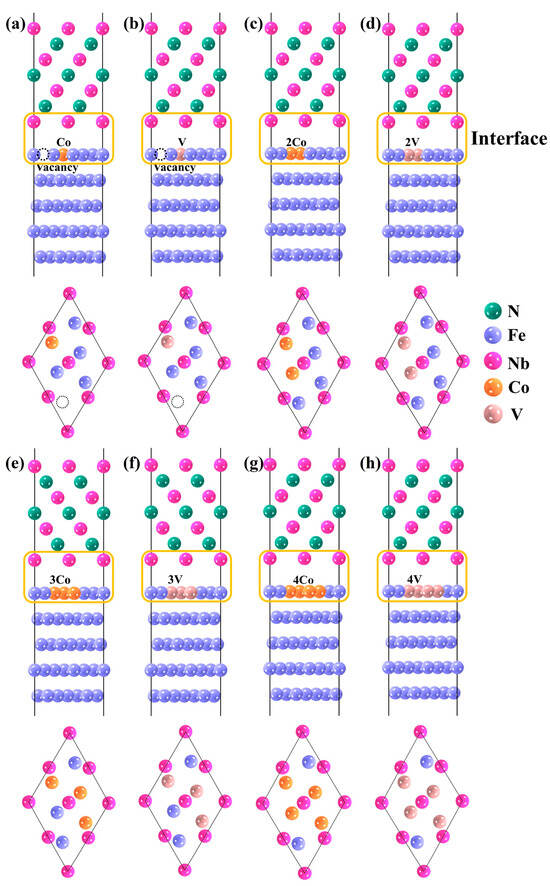 represents the total energy of the interfacial structure containing a vacancy at different positions of the interface, then represents the total energy of the pure interfacial fcc-Fe(111)/NbN(111), and Atom represents the energy of each atom in the reference state fcc-Fe. The smaller the vacancy formation energy, the stronger the tendency of vacancy formation at the interface, and vice versa, the lower the possibility of vacancy formation at the interface. The calculated vacancy formation energy is also summarized in Table 2. It can be noted that the formation energy of vacancy 1 is the largest, followed by vacancy 2, and the value of vacancy 3 is the smallest, which is 0.648 eV; thus, vacancy 3 is chosen for the subsequent research. The model containing both vacancies and alloying elements (Co, V) is presented in Figure 11a,b. The modeling of the interface fcc-Fe(111)/NbN(111) doped with different contents of alloying elements is shown in Figure 11c–h, and the variations in the contents of the two alloying elements, Co and V, are reflected by the doping of two, three, and four Co or V atoms at the interface, respectively.