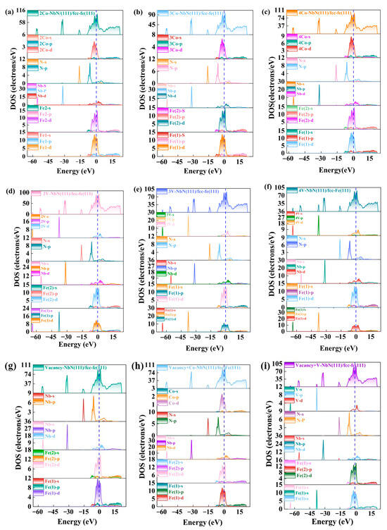 The density of states (DOS) doped with different contents of alloying elements fcc-Fe(111)/NbN(111) is illustrated in Figure 12. The blue vertical dashed lines represent Fermi levels and the density of states values at the Fermi levels are not zero, indicating that all interfaces possess a certain metallicity. It can be seen in Figure 12a–c that the partial densities of the atomic layers on the Fe matrix side and the NbN side at the interface are different from the internal atomic layers, and the content of the dopant alloying elements has little effect on the atoms far from the interface. In the vicinity of the Fermi level, the total density of states is dominated by the contribution of the d-orbitals of Fe atoms and the d-orbital electrons of Co atoms, with a weak contribution from the d-orbitals of Nb atoms. As the doped Co content increases, the contribution of the Co-d orbital electrons also increases. The peak intensity of the d orbitals of Co atoms near the Fermi energy level increases significantly when the number of doped Co at the interface is changed from two to three atoms, yet the fractional density of states changes little when the number of doped Co atoms is changed from three to four. As can be seen from Figure 12d–f, the total density of states is mainly contributed by the V-s orbital electrons in the energy range from −65 eV to −60 eV, and the peak intensity of the s orbitals at −63 eV increases significantly with the increase of V content, and it is mainly contributed by the V-p orbital electrons in the energy range from −45 eV to −35 eV. From the −30 eV to −10 eV energy range, the total density of states is mainly contributed by the p-orbital electrons of Nb atoms and the s-orbital electrons of N atoms. In the vicinity of the Fermi level, the change in the V atomic partition density is unobvious.