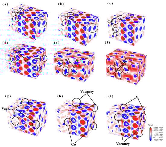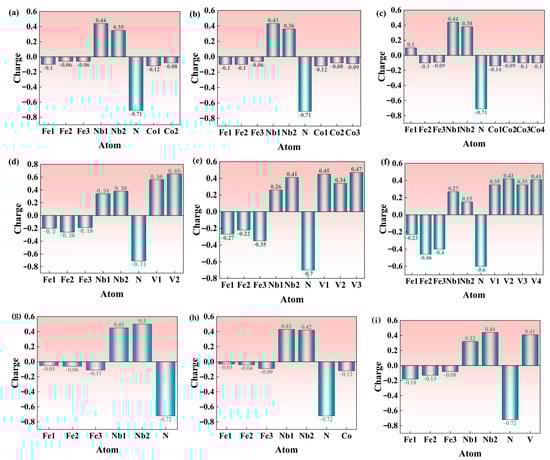 Population analysis may examine the distribution of electrons in different orbitals to reveal the charge distribution, charge transfer, bonding property, and chemical features between atoms. Figure 14 depicts the charge transfer for doping with different content of alloying elements. Fe1, Fe2, and Fe3 are the Fe atoms around the dopant atoms, respectively, and the charge obtained by the Co atoms varies with the Co content of the dopant alloying element, and the charge obtained by the dopant Co, 2Co, 3Co, and 4Co at the interfaces are 0.15 e, 0.20 e, 0.29 e, and 0.43 e, respectively. The change in the charge obtained by the Fe atoms around the doped element is minor, yet there is a significant decrease in the charge obtained by the surrounding Fe atoms when doped with four Co atoms as compared to that of the other content models. From Figure 14d,e, the charge lost by doping V, 2V, 3V, and 4V at the interface are 0.47 e, 1.21 e, 2.26 e, and 1.53 e, respectively, and the charge lost by the N atoms are almost unchanged, while the charge lost by the surrounding Fe atoms are significantly increased. The total charge obtained by the Nb atoms is 0.69 e, 0.72 e, 0.67 e, and 0.42 e for V, 2V, 3V, and 4V doping at the interface, respectively. The number of charges lost by Nb atoms at the interface is significantly reduced when doped with 4V atoms compared to other doping content models. Figure 14g–i presents the charge transfer maps containing both vacancies and alloying elements. When the vacancies are introduced, Fe1, Fe2, and Fe3 reach charges of 0.05 e, 0.06 e, and 0.11 e, respectively, slightly higher than those before vacancies are introduced, and the amount of charge lost by N atoms is almost unchanged. When containing both vacancies and the alloying element Co, Fe1, Fe2, and Fe3 gain charge of 0.03 e, 0.04 e, and 0.09 e, respectively, and the Co atom loses 0.12 e. There is a slight decrease in the amount of charge gained by Fe atoms compared to the interface containing only vacancy, and there is a decrease in the amount of charge lost by Nb1 and Nb2. When both vacancies and alloying element V are included, Fe1, Fe2, and Fe3 get 0.18 e, 0.13 e, and 0.08 e, respectively, which is an increase in the number of charge obtained by Fe atoms compared to the interface containing only vacancy, and the charge loss of Nb1 and Nb2 atoms follows a decreasing trend, and V atoms receive 0.41 e.