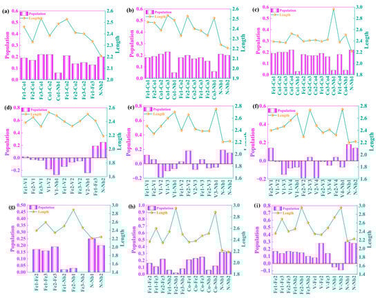 Bond length and bond population maps doped by (a) 2Co, (b) 3Co, (c) 4Co, (d) 2V, (e) 3V, and (f) 4V, with both vacancies and alloying elements (g) pure vacancy, (h) vacancy and Co, and (i) vacancy and V.