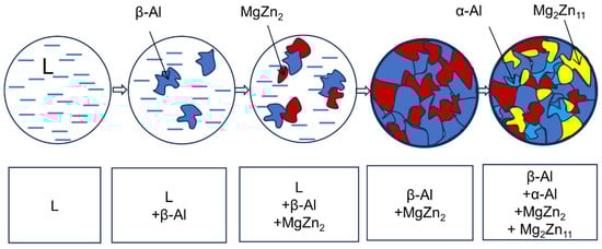 - During the formation of the solidification structure of the Zn-19Al-6Mg alloy, the primary β-Al phase precipitates Zn and forms the α-Al phase. Due to the cooling rate in the actual transformation process, the precipitated Zn cannot completely form Mg2Zn11 with the MgZn2 phase, resulting in the Zn-rich phase in some regions of the structure.