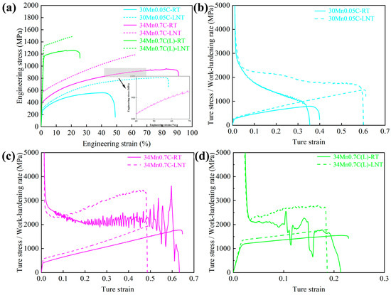 Tensile behavior of the 30Mn0.05C, 34Mn0.7C, and 34Mn0.7C(L) specimens at RT and LNT. (a) Engineering stress-strain curves. The inset shows serrations on the curve. (b–d) Corresponding work-hardening and true stress-strain curves.