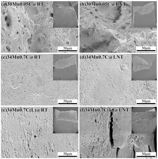 The fracture morphology of the 30Mn0.05C, 34Mn0.7C, and 34Mn0.7C(L) specimens at RT and LNT. (a,c,e) respectively 30Mn0.05C, 34Mn0.7C and 34Mn0.7C at RT. (b,d,f) respectively 30Mn0.05C, 34Mn0.7C and 34Mn0.7C at LNT.