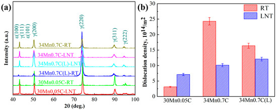 Figure 4 displays the XRD patterns of the three specimens of 30Mn0.05C, 34Mn0.7C, and 34Mn0.7C(L) after tensile fracture at RT and LNT. It can be observed that the 30Mn0.05C sample exhibits both austenite (FCC) and martensite (HCP) peaks at LNT, whereas the other samples only display austenite peaks at both RT and LNT, indicating that no strain-induced martensitic transformation occurred during deformation. Furthermore, the dislocation density (ρ) is calculated through the following relationship [34,35,36]: