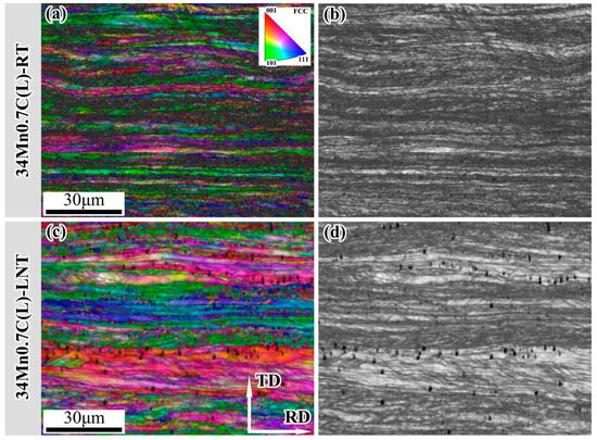 The microstructure of the 34Mn0.7C(L) tensile fracture at RT and LNT. (a,b) IPF + IQ image and (c,d) SEM images, (a,c) at RT, (b,d) at LNT.