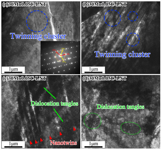 Typical TEM images of 30Mn0.05C after tensile tested at LNT. (a) Twining cluster composed of nanotwins formed in the 30Mn0.05C-LNT, fractured, and corresponding selected area electron diffraction pattern (SAEDP) found in the 30Mn0.05C-LNT fractured. (b) Twining cluster (c) nanotwins and dislocation tangles. (d) dislocation tangles in different regions.