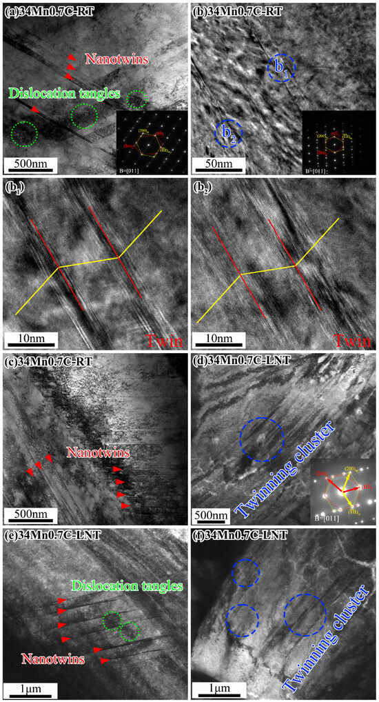 TEM characterization of 34Mn0.7C after tensile tested at RT and LNT. (a,b) BF and SAED images of nanotwins in 34Mn0.7C-RT specimen, (b1,b2) the HRTEM images of nanotwins in 34Mn0.7C-RT specimen, with red lines demarcating twin boundaries (TBs) and yellow regions indicating the austenitic matrix orientation, (c) primary twin and secondary twin in 34Mn0.7C-RT specimen, (d–f) BF and SAED images of nanotwins, dislocation tangles, and twinning cluster in 34Mn0.7C-LNT specimen.
