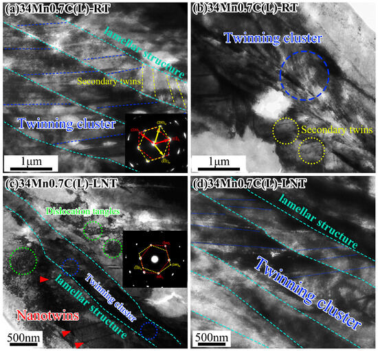 Further microscopic observations of the deformed microstructures of the 30Mn0.05C, 34Mn0.7C, and 34Mn0.7C(L) specimens fractured under RT and LNT conditions were conducted using TEM, as shown in Figure 7, Figure 8 and Figure 9.