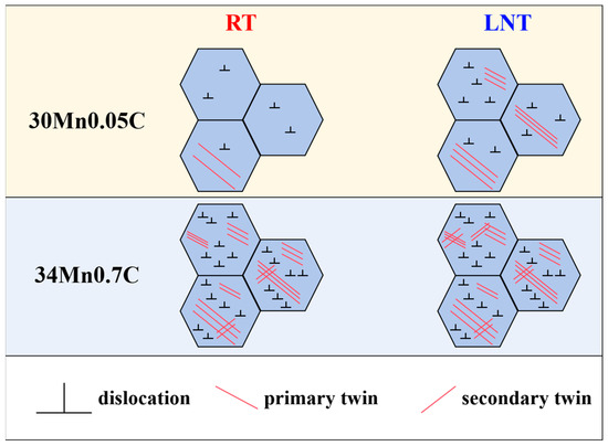 The schematic diagram showing the deformation mechanism of 30Mn0.05C and 34Mn0.7C at RT and LNT.